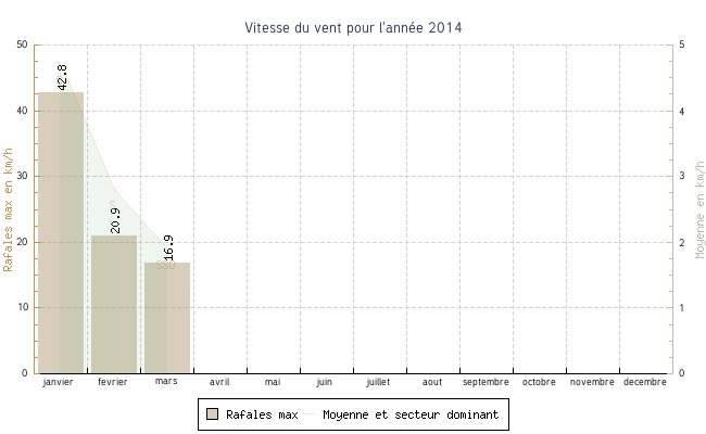 | janvier | -1.9 °C | 3.6 °C | 13.6 °C | 8.5 °C | 6.1 °C | 4.7 km/h | 42.8 km/h | S |